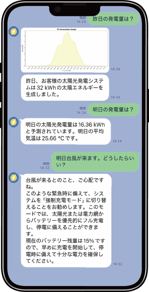 LINEで気軽にお尋ねください。「Skychat」が今日の発電量からシステム設定情報まで、あなたの疑問にわかりやすくお答えします。